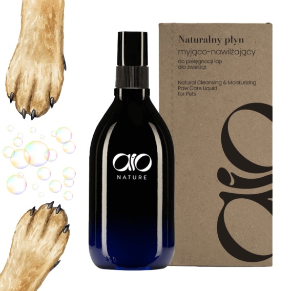 Zadbaj o czystość i komfort łap swojego pupila po każdym spacerze z AIO Nature – Płynem myjąco-nawilżającym do psich łap.