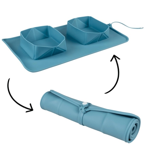 Podróżna mata z miskami DUVO+ 2 x 600 ml to kompaktowy zestaw idealny na spacer, wyjazd i podróż z psem.