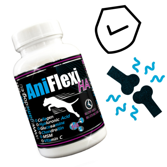 Game Dog AniFlexi HA – 150 tabletek Suplement wspomagający stawy dla psów w każdym wieku. Zawiera kolagen, glukozaminę, MSM, chondroitynę i kwas hialuronowy – składniki wspierające regenerację chrząstek, zmniejszające ból i stany zapalne. Idealny przy zwyrodnieniach, problemach z kręgosłupem oraz dla szczeniąt i ras brachycefalicznych. Wspiera ruchomość, elastyczność i zdrowie układu ruchu.