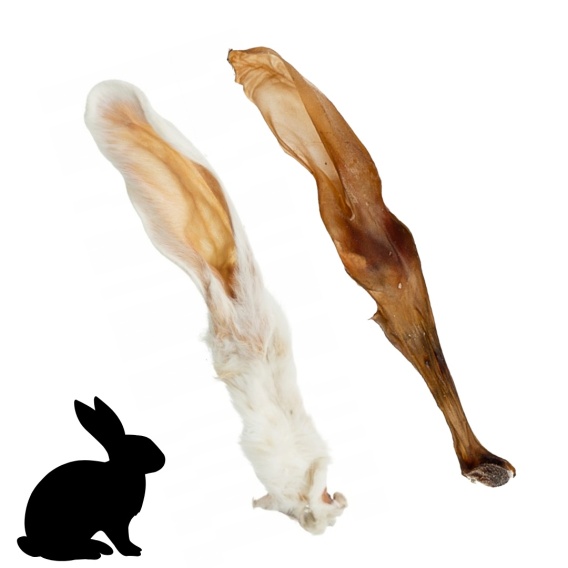 Zestaw 2 uszu króliczych – jedno z futrem, drugie bez. Idealny na próbę dla szczeniąt i małych ras. Naturalne, lekkostrawne i bezzbożowe.