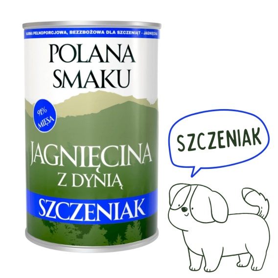 Polana Smaku – Jagnięcina z dynią karma mokra dla szczeniąt 400g to pełnoporcjowa, naturalna karma stworzona specjalnie dla młodych psów w okresie intensywnego wzrostu. Delikatna jagnięcina stanowi źródło lekkostrawnego białka, żelaza i cynku, które wspierają rozwój mięśni oraz odporność szczenięcia.