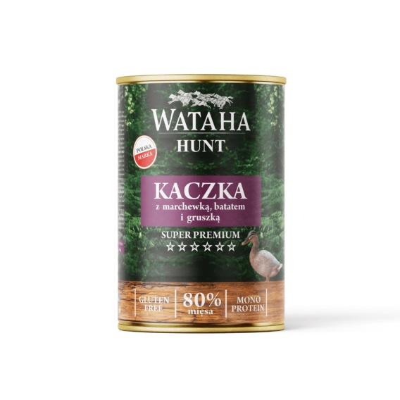 Naturalna mokra karma dla psa Wataha Hunt – Kaczka z marchewką, batatem i gruszką 400g. Zdrowa, smaczna i przygotowana z polskich składników.